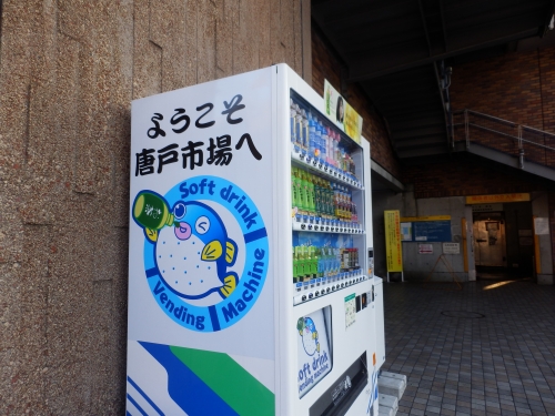 下関の道は広くてとてもきれい。歩き回ってみるのもおすすめです。お楽しみはふぐ探し!唐戸市場の近くの自動販売機にもふぐ。カフェのロゴもふぐ。