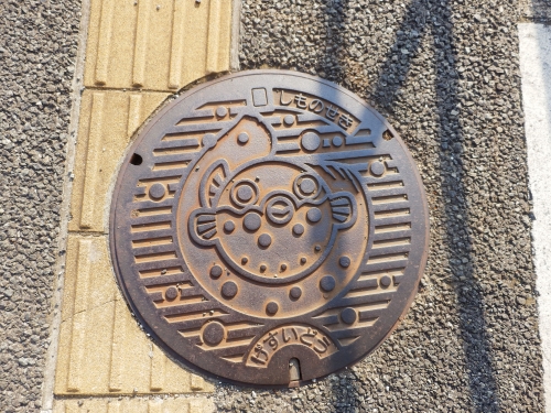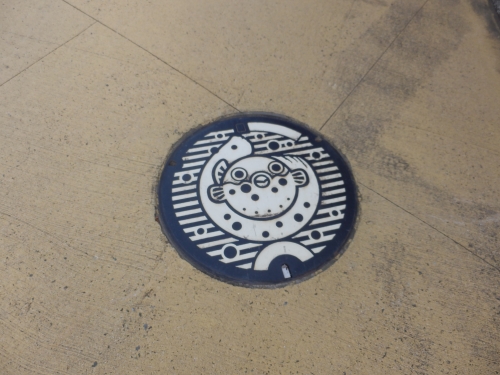 道端の下水道管のふたにもふぐ。下関市では「フクフクマーク」と呼んでいます。カラーもあるようなので、探してみると楽しそう。