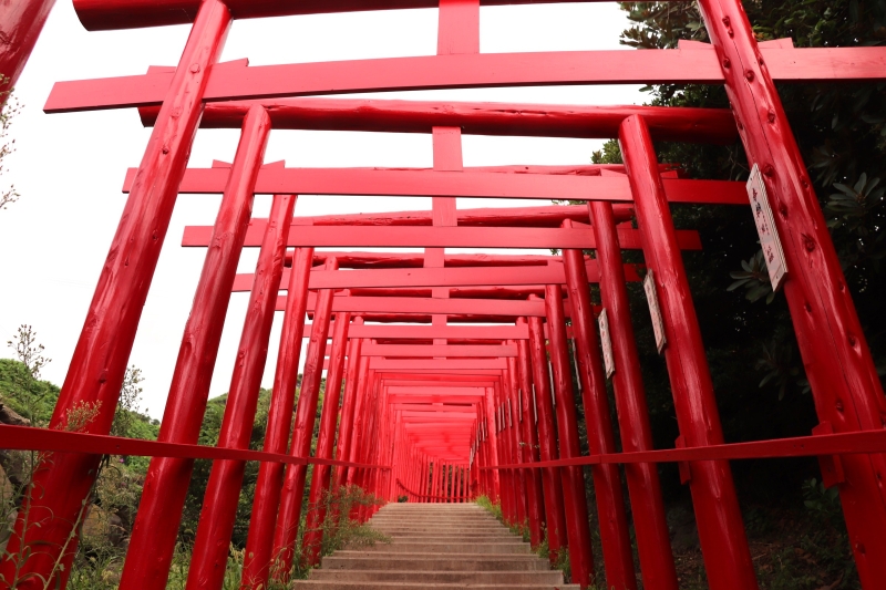 日本海沿いの長門市にある元乃隅神社は、断崖絶壁をうねうねと下るように赤い鳥居が幾重にも連なる絶景の神社として有名な神社です。123基もの鳥居が連なる景色はまさに圧巻です。