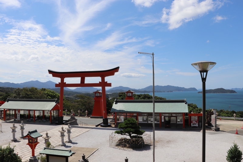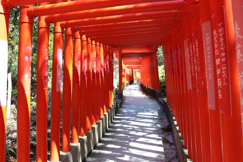 山口県の西側、関門海峡の北西に広がる響灘沿いの小高いところにある福徳稲荷神社は、赤い千本鳥居と青い海、そして海に浮かぶ島々のコントラストが美しい神社です。