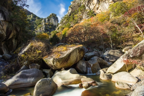 国の特別名勝に指定されている昇仙峡は、切り立った断崖に奇岩や珍しい石が並ぶ日本屈指の渓谷。荒川沿いに約4㎞続く遊歩道を降りてすぐのところにあるのが、日本の滝百選に選出されている「仙娥滝(せんがたき)」です。落差30mあり、水が滝壺へ一気に流れ落ちる様子は圧巻!そして昇仙峡のシンボルといえば「覚円峰(かくえんぼう)」。白い岩肌と緑の木々、秋には紅葉のコントラストがとても美しい景勝地です。