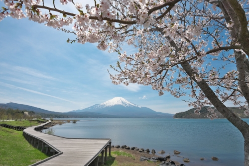 富士五湖の中で最も広い面積を誇り、日本で三番目の高さに位置する湖。湖畔からは富士山を眺められ、特に毎年10月中旬から2月末の日没時に見られる「ダイヤモンド富士」の景色が人気です。また遊覧船「白鳥の湖」号で湖の周遊や、水陸両用バス「KABA」でもアトラクションのようなクルージングを楽しめます。