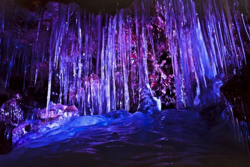洞窟内の温度は常に0~4度に保たれているため、1年を通して見事な氷柱や氷の壁を見ることができ、夏には涼を求めて特に多くの人が訪れます。氷穴全体は12分ほどで巡れますが、たて穴のため階段が多く、下りと登りを合わせた階段総数は168段。溶岩のゴツゴツとした岩肌を進んでいきます。頭上注意や足元注意の場所も多く、天井が最も低い場所では91cmしかありません!