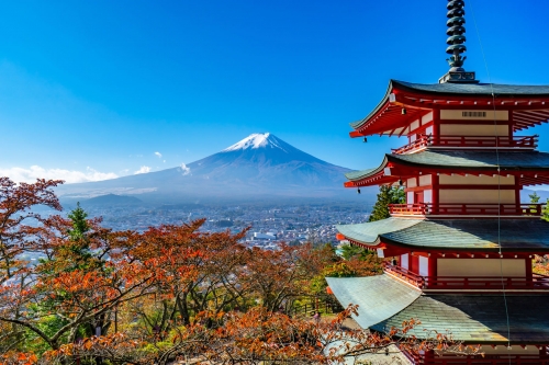 新倉山の中腹にある「新倉山浅間公園」は、”これぞニッポン!”という絶景が楽しめる公園です。五重塔(忠霊塔)と富士山、そして春には桜、秋には紅葉と、まるで絵ハガキのような絶景を眺めることができます。忠霊塔は22時までライトアップされ、夜には妖艶で美しい景色に様変わりします。