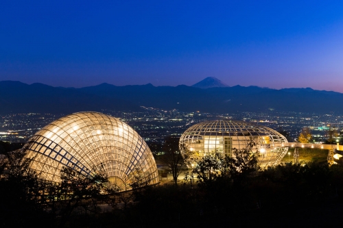 ”新日本三大夜景”のひとつに認定された夜景の絶景スポット。甲府盆地を見下ろす約32万㎡もの広大な敷地では、一年をとおして、様々なフルーツや花、木々が楽しめます。公園を象徴するふたつのスケルトンのドーム「わんぱくドーム」と「くだもの工房のドーム」のライトアップも美しく、また園内には、山梨の食材を使った料理と絶景を楽しめる「展望☆星屑レストラン ガイア」があります。