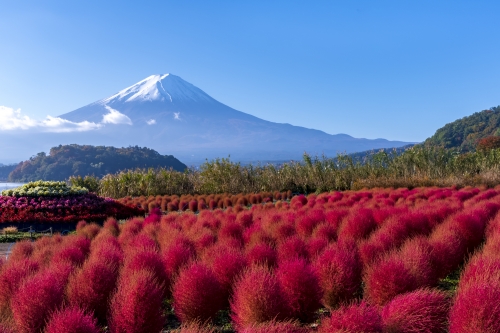 富士五湖の一つで、3番目に大きい湖。水深はもっとも深く最大121.6mにも及びます。千円札の裏側に描かれている富士山の風景は、この本栖湖湖畔から撮られた写真が元になっているので、ぜひ千円札と照らし合わせてみて下さいね。湖畔はとても空気が澄んでいるのがよくわかり、圧倒的な大きさと美しさの富士山は、目の前で見るとパワーをもらえます。