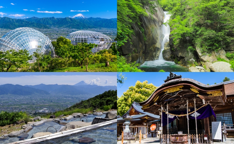 1日目は笛吹川フルーツ公園にほったらかし温泉、ぶどうの丘、桔梗信玄餅工場テーマパークを訪れて石和温泉に宿泊し、2日目は武田神社、舞鶴城、昇仙峡を巡る1泊2日の山梨旅行プランをご紹介します。