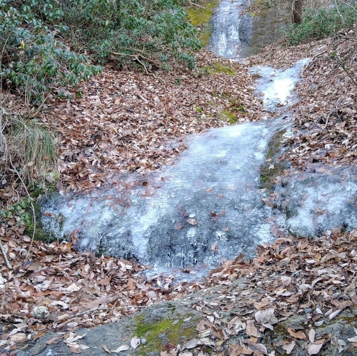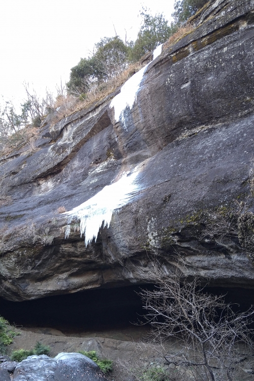 冬の時期は岩肌を流れる滝が凍るので、洞窟入り口をはっきりと覗くことができます。滝が凍るのを見られるのは、この季節ならではです。岩場は滑りやすいので、近づきすぎないように注意しましょう。