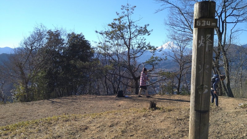 山頂は、登山口からは約40分で、20人ほどが滞在できる広場になっています。標高634mで、スカイツリーと同じ高さです。山頂から富士山を見ることができますが、木の枝がかぶってしまうので、後述する丸山公園からの方がはっきりと見られます。