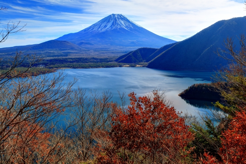 富士箱根伊豆国立公園に指定されている富士五湖(河口湖、山中湖、本栖湖、精進湖、西湖)のひとつで、最大深水は121.6mと五湖の中で最も深く、一周約13km、面積は3番目に大きい湖が本栖湖です。2013年、「富士山-信仰の対象と芸術の源泉」の構成資産(富士山域)の1つとして、世界文化遺産に登録されました。