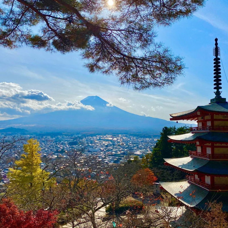 新倉山の中腹にある「新倉山浅間公園」は、”これぞニッポン!”という絶景が楽しめる公園。園内にある「新倉富士浅間神社」の境内に展望デッキが設けられており、五重塔(忠霊塔)と富士山、桜の木という日本らしさが詰まった風景を眺めることができ、外国人を中心に人気を集めています。