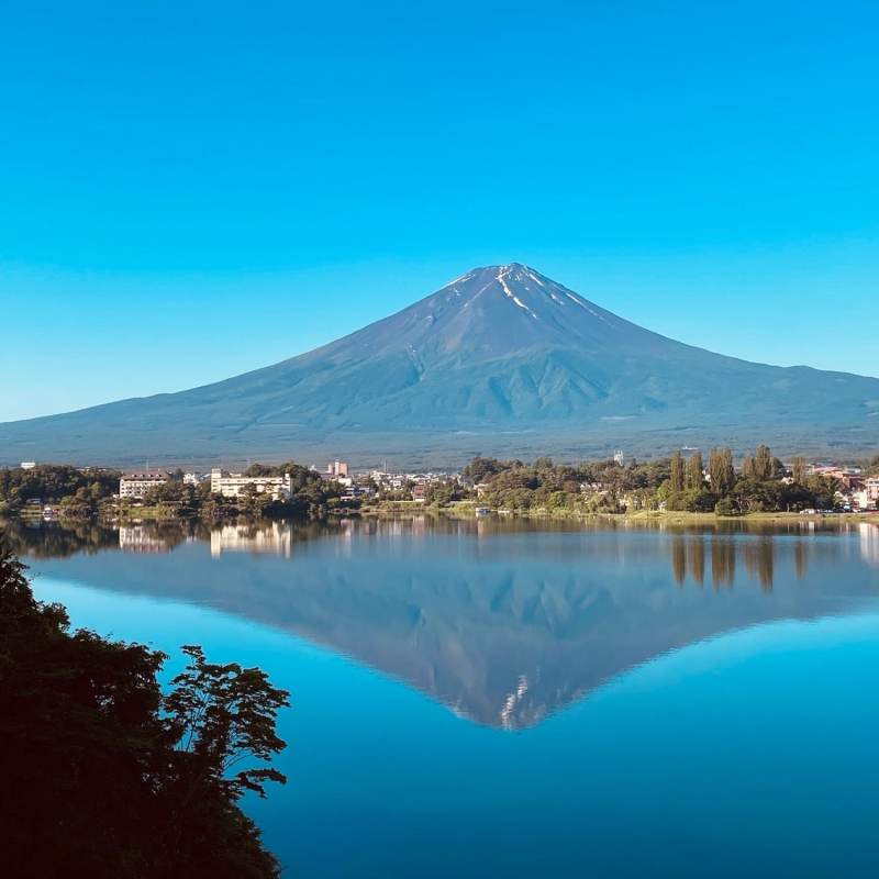 湖畔には富士山を望むさまざまなビューポイントがありますが、浅川エリアにある湖畔荘前のウォーキングロードはとくにおすすめ。湖畔に沿って道が伸びており、富士山の眺めを楽しみつつ散策ができます。
