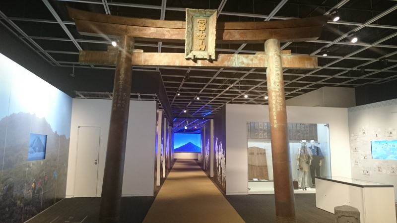 展示通路の入り口には金鳥居のレプリカが展示されています。富士山頂へ続く吉田登山道のいちばん初めの鳥居であることから「一ノ鳥居」とも呼ばれており、富士山信仰の世界と俗界を分かつ境界でもあります。本物の鳥居は、今でも富士吉田市の市街地中心の富士山へ続く道にそびえています。