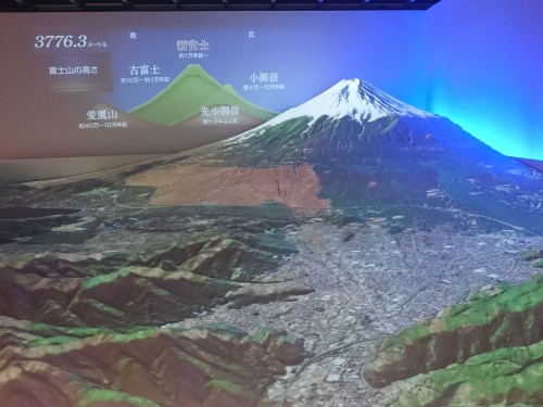 もう一つのふじさんミュージアムの見どころが、1/2,000スケールの富士山の大型模型。模型に投影されるプロジェクションマッピングで、地理や歴史、季節を学ぶことができます。富士山を上空から眺めるような視点で、溶岩の流れ方や、富士山が形成されていく様子を見ることができ、より理解が深まります。