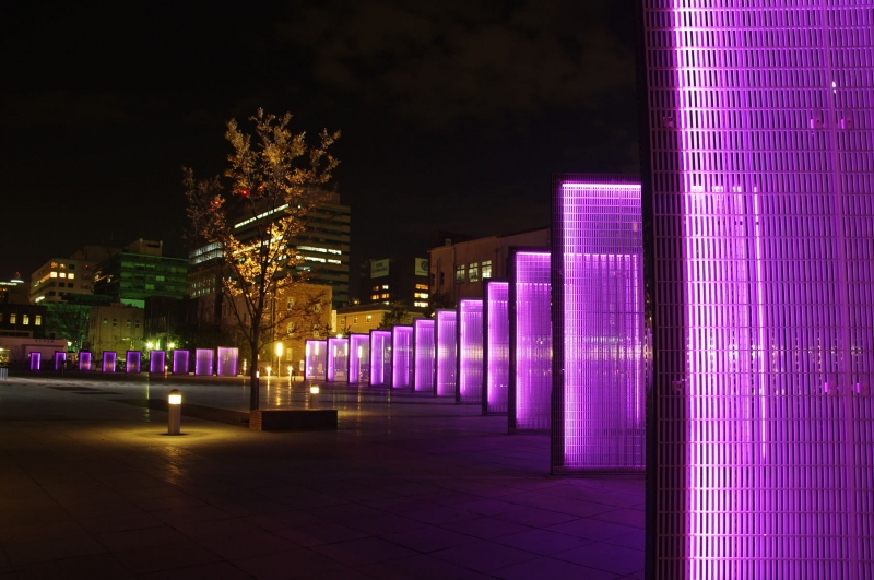 山下臨港プロムナード沿いの海浜公園。公園内に設置されているスクリーンパネルは、夜になると時間ごとにその色を変え、幻想的な雰囲気を醸し出します。公園内から見える港の夜景と相まって、息をのむほどの美しさ。日没~20:00は電球色、20:00~22:00は薄紫色、22:00~日の出は青色に光ります。