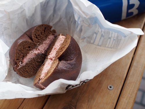 左の写真はライ麦生地にチョコチップを混ぜたプンパニッケルベーグルに、ストロベリーチーズを挟んだサンド。右の写真は、プレーンベーグルにLOX(スモークサーモン&ディル&クリームチーズ)をサンドしたもの。