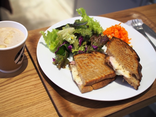こちらは、スモークハムとグリュイエールチーズのホットプレスサンド。サンドイッチとその日のデリ2種がセットになっています。サンドイッチはチーズの濃厚な味と、バターの風味が口いっぱいに広がって、本当に美味しい!