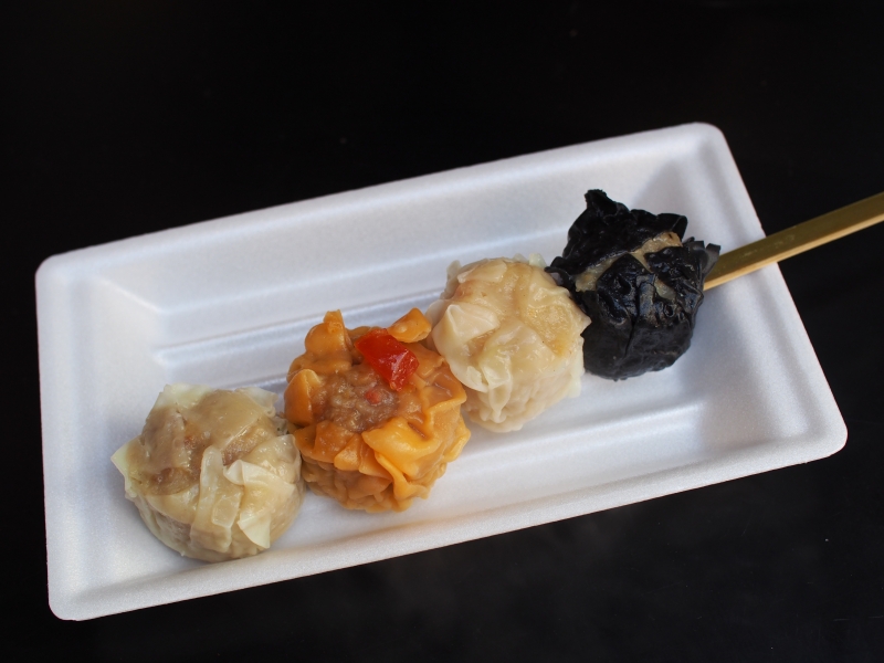 なかでも一番人気は、昔ながらのスタンダードな「百年シュウマイ」、酸味の効いた「トマトシュウマイ」、プリプリ感がたまらない「海老シュウマイ」、炭を練り込んだ「黒船シュウマイ」が1つずつ串に刺さった「食べくらべ串」。