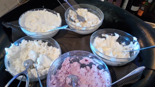 品数が多いビュッフェの中でも、もちろん目玉は自家製フレッシュチーズのコーナー。常時5種類前後のチーズが、大きめのガラスボウルに盛り付けられています。ブルーベリーやアロエなど、フルーティーな味わいのリコッタチーズも。パンにたっぷり塗っていただきたいですね。