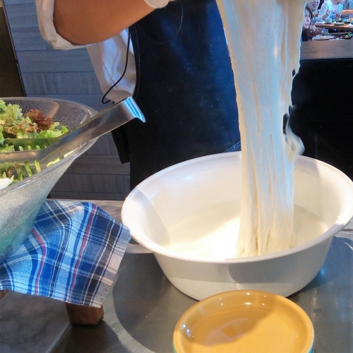 スタッフさんがアツアツのチーズを持ち上げると、まるでおもちのように伸びる!湯気とともにミルクのいい香りが漂い、思わず歓声があがります。できあがったモッツァレラチーズは、一口大にちぎったものを人数分いただけますよ。口に入れると“キュッキュッ”と音がするほど弾力のある食感に、驚かされます。