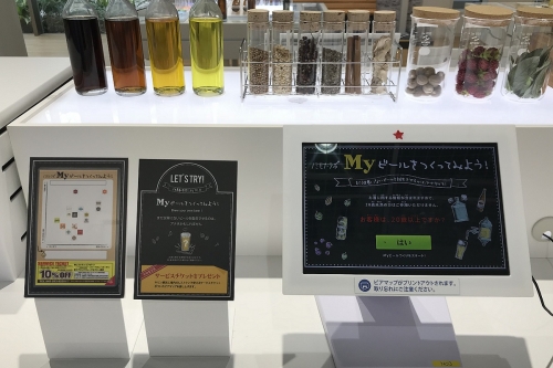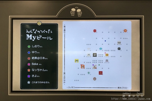 また、「MYビールをつくってみよう!」では、香りや材料などを選ぶ事で自分好みのビールを作る事ができます。作ったビールは大きな電光掲示板に表示されるので、他の人がどんなビールを作ったのか見る事も出来ます。