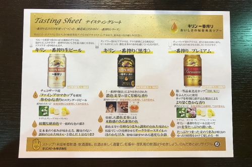- 1.キリン1番搾り おいしさの秘密発見ツアー:1番搾り麦汁と2番搾り麦汁の飲み比べ、麦芽の試食、ホップの香りを体験できる
