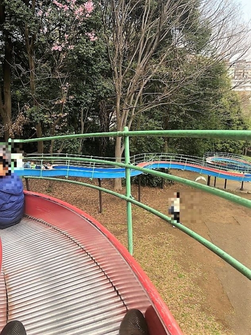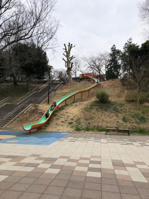 広い園内には遊具のある「子どもの遊び場」が点在していますが、一番の人気は公園の北東側の「わんぱく広場」。テニスコートの横を通り過ぎ、戦没者慰霊塔の広場の奥にあるので少し分かり辛いかもしれませんが、ここには一番人気の「ロング滑り台」があります。