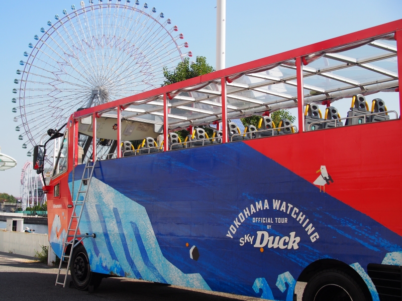 バスとして陸を走り、船として水上も走行する水陸両用バスで、なとみらい地区を陸と海から観光できるアクティビティ。