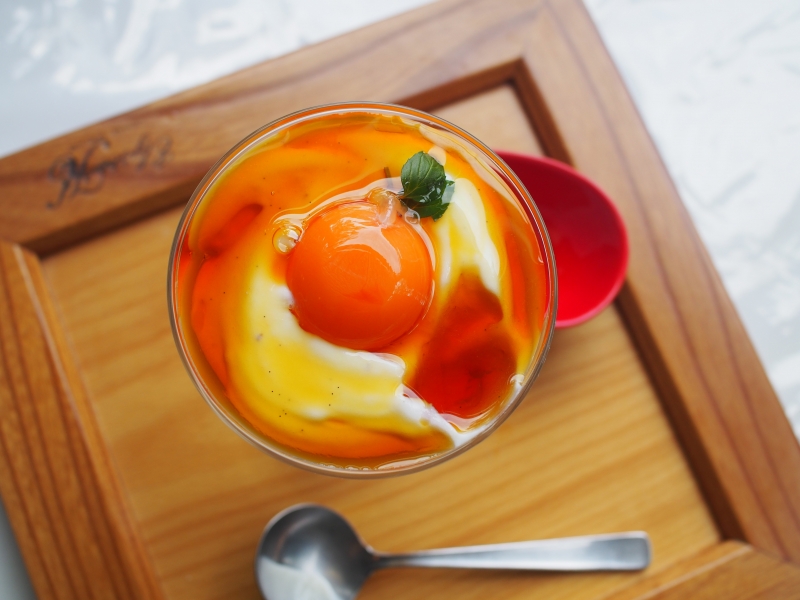 バニラムースに生の卵黄を落とし、キャラメルソースと混ぜて食べるとアラ不思議、プリンの味がしてきます。