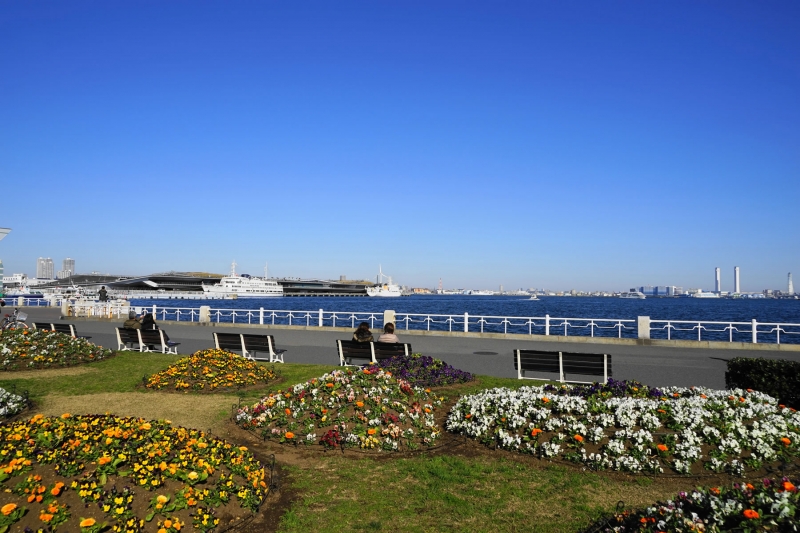 「山下公園」は重要文化財指定を受けている「日本郵船氷川丸」がひときわ目を引く臨海公園。横浜港に沿って約700m続く細長い園内には緑も多く、バラやセージなどの花が綺麗に咲いています。