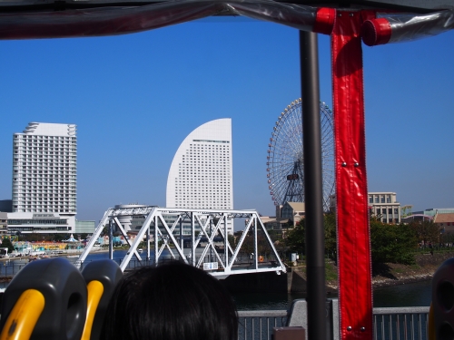 陸路でも横浜ランドマークタワー、コスモクロック(大観覧車)、赤レンガ倉庫と、観光のポイントはきちんとおさえます。ガイドさんが見えるものをひとつひとつ説明してくれるので、楽しいですよ。