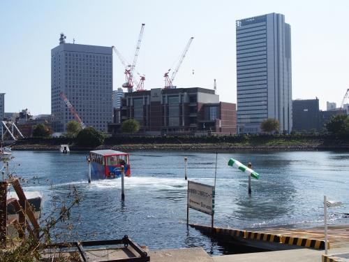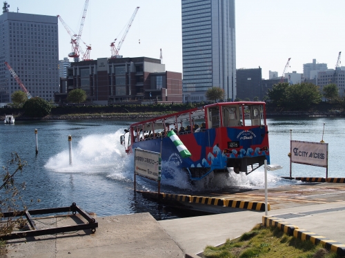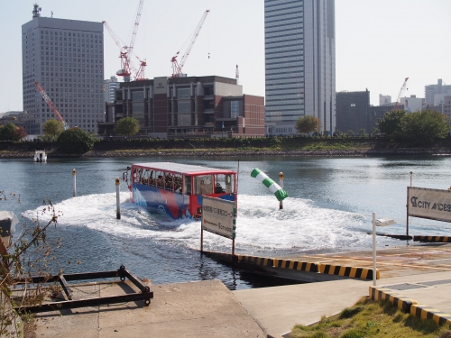 入水ポイントでスカイダックを撮影してみるとこんな感じです。バスなのにズブズブと水の中に入っていき、