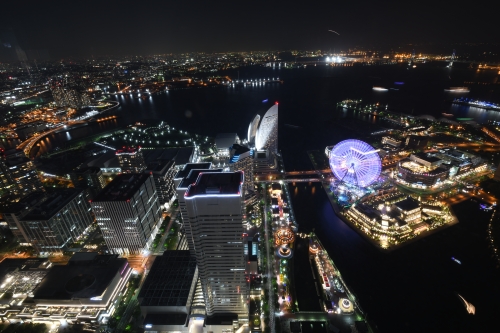 360度横浜の絶景が楽しめる69階スカイガーデンへは、エレベーターは約40秒ほどで昇りきり、この速度は日本最速、下りに限って言えば世界最速です。天気の良い日には富士山までも眺められ、夜はロマンチックな夜景にため息が出そう。