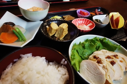 地元の家庭で昔から食べられてきた麹を使い、料理に使用している野菜や山菜は、増田の朝市で購入した特産品だそうです。お食事の際にだされる麹茶の量り売りもしています。