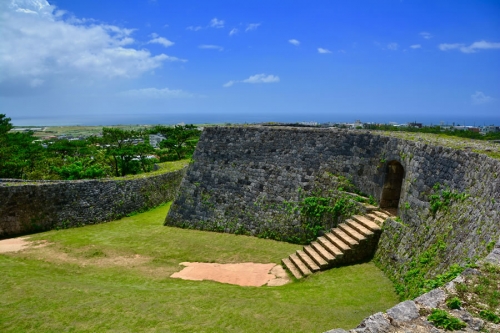 「座喜味城跡(ざきみじょうあと)」は、15世紀、琉球王国の英雄・護佐丸によって当時の琉球国王に対抗する勢力を監視する目的で建てられた「座喜味城」の跡地です。平成12年(2000年)、首里城とともに「琉球王国のグスク及び関連道産群」の一つとして世界遺産に登録されました。座喜味城を建てた護佐丸は「築城の名手」として知られていますが、そう言われるゆえんとなったのが、こちらの城です。美しいアーチ形の石門や大きくうねった城壁が美しい城で、城壁である石垣に直接登ることができるのはここだけです。石垣の上から見ると、攻めてきた敵に対抗できるように考えて造られた、その城壁の「うねり」がよく分かります。石積みの精巧さや美しさは、沖縄の城の中でも随一と言われています。