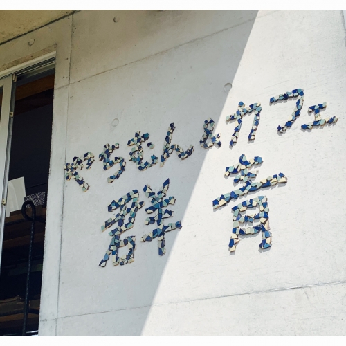 那覇空港から車で1時間ほど、沖縄中部エリアに位置する読⾕村の西海岸にあるカフェ。入り江に沿うように高台に建っているため水平線を一望でき、夕方には海に日が落ちるドラマティックな景色が広がります。