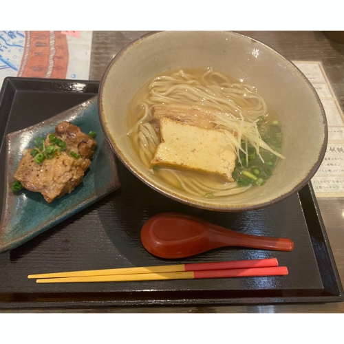 読谷村にある、沖縄そばの人気店。8種類もの魚節で取った出汁がきいたスープが評判のお店で、週末には行列ができることも珍しくありません。
