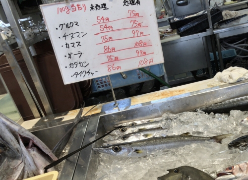 地元の方も多くお買い物に来るようで、すぐに食べられるお刺身もたくさん♪ 沖縄ならではの ミジュン(青魚) や ティラジャー(巻貝)、その他にも、マグロ、タコ、ホタテ、イカなど色々あります。