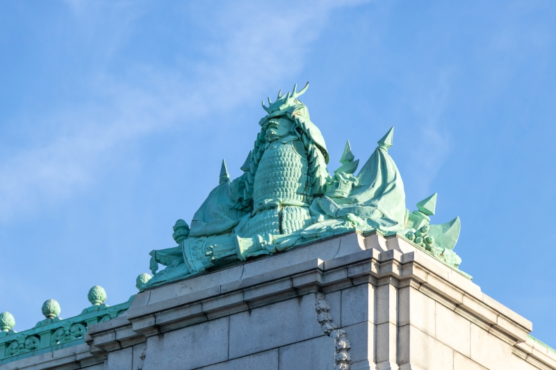 外観は洋式ですが、所々に和のあしらいをみることができます。本館正面の中央左右に武士の青銅が鎮座しています。口の形が一つは空いており、一つは閉じています。これは、「阿吽」の形を表していると言われています。