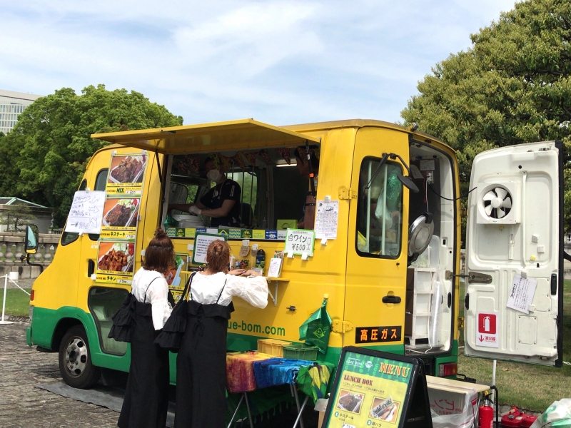 期間限定ですが、迎賓館前庭でキッチンカーによるカフェ、アルコール、食事を楽しむ事ができます。夜になると、本館がライトアップされとても綺麗です。