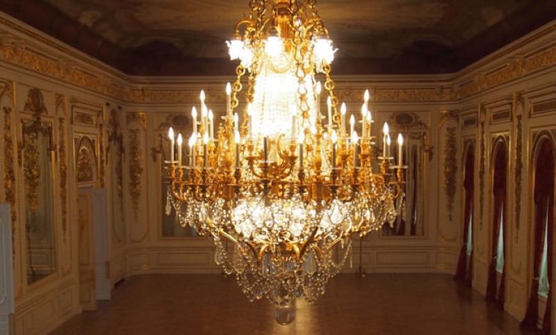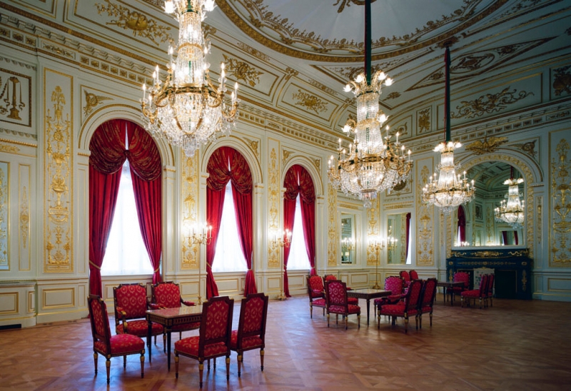 一際目を引くのは、迎賓館赤坂離宮の中で最大級の約7,000個ものパーツから出来ているシャンデリアです。クリスタルガラスの輝きもきらびやかで、晩餐会にふさわしい部屋となっています。