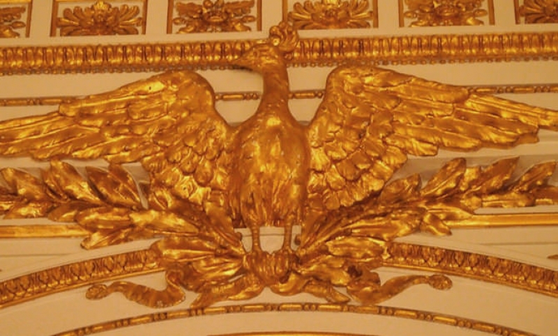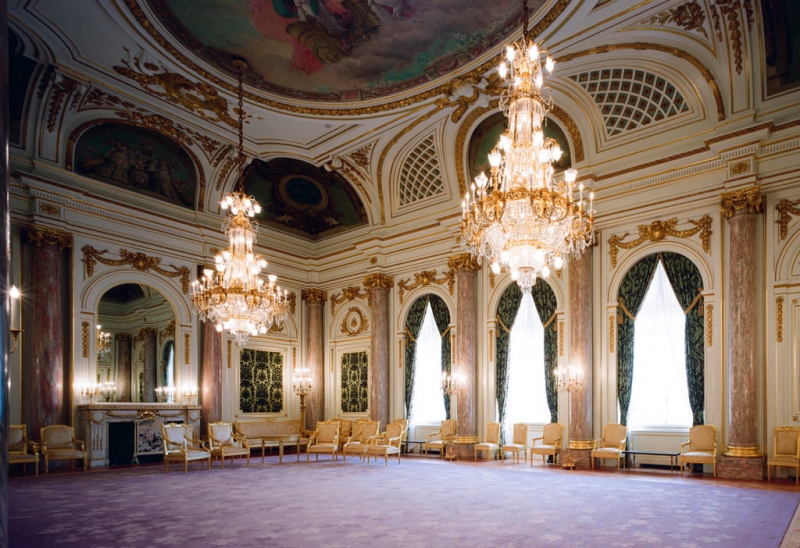 迎賓館赤坂離宮で最も格式の高いと言われる「朝日の間」。首脳会談などにも使用され、客間や応接室として賓客をむかえています。フランス人画家が描いた、「朝日の間」の名の由来にもなった天井画は、朝日を背景とし、女神オーロラが、白馬と共に天空を駆る姿が描かれています。