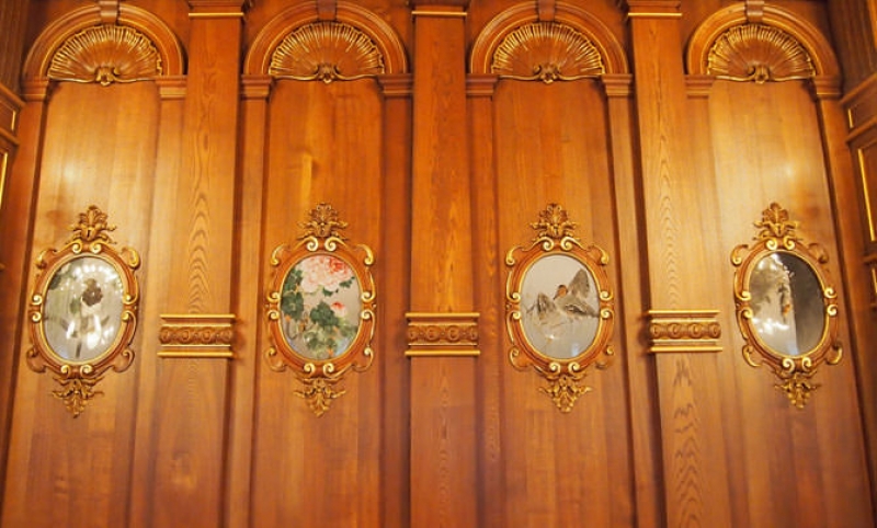 特に印象的なものは、四季折々の花や鳥を描かれた七宝焼。壁面には、四季折々の花や鳥の七宝の最高傑作と言われる七宝焼が多数飾られています。菊の御紋の入った木製彫刻の大食器棚は、フランスから輸入されたもので重厚感がありとても豪華です。