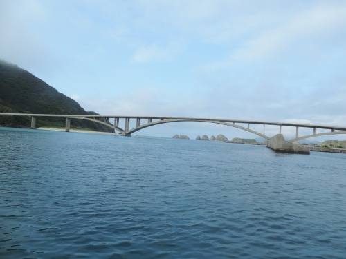阿嘉島と慶留間島を結ぶ全長530mの橋として1998年に完成しました。橋の上からはコバルトブルーの海を臨む事ができ、またフェリーが発着する阿嘉新港や地元の漁船の波止場になっている阿嘉港と阿嘉島の集落、奇妙な形をした奇岩群「佐久原奇岩」など阿嘉島の風景を一望する事ができます。