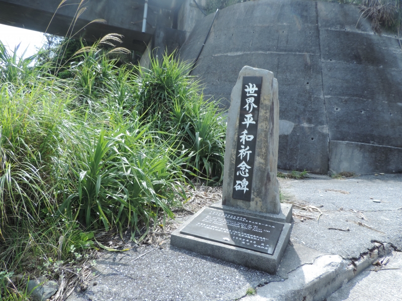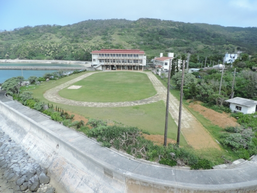 また、海峡を挟んだ対岸には赤い屋根と青い海、整備されたグランドが離島間を演出している島の小・中学校がある他、第二次世界大戦末期には地上戦も行われた場所であることから、アメリカ軍上陸の浜辺には「世界平和記念碑」の石碑が設置されています。