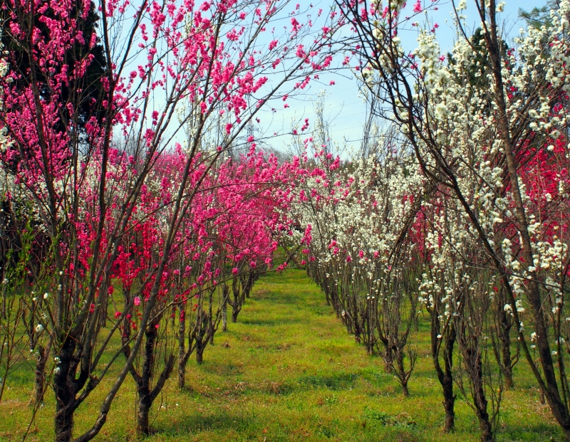 観光花木園に植えられている多くの花桃の特徴は、竹ボウキをひっくり返したように、枝が天に向かってすっと伸びていること。「照手桃」という品種で、花の色はピンク、赤、白の3種類。一列ごと、異なる色の照手桃が等間隔で植えられ、色とりどりの花のトンネルがいくつも並びます。